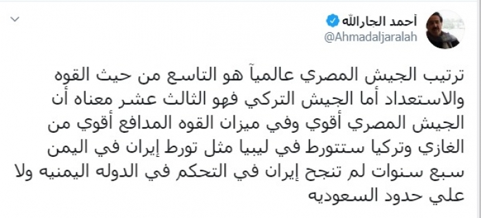 وكتب عبر تغريدة له على "تويتر" رصدها" المشهد العربي":" ترتيب الجيش المصري عالميا هو التاسع من حيث القوة والاستعداد، أما الجيش التركي فهو الثالث عشر معناه أن الجيش المصري أقوى وفي ميزان القوى المدافع أقوى من الغازي، وتركيا ستتورط في ليبيا مثل تورط إيران في اليمن، سبع سنوات لم تنجح إيران في التحكم في الدولة اليمنية ولا علة حدود السعودية".