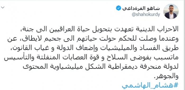 وكتب عبر تغريدة له على "تويتر" رصدها " المشهد العربي": "الأحزاب الدينية تعهدت بتحويل حياة العراقيين إلى جنة، وعندما وصلت للحكم حولت حياتهم إلى جحيم لا يطاق، عن طريق الفساد والمليشيات وإضعاف الدولة و غياب القانون، ما تسبب بفوضى السلاح و قوة العصابات المنفلتة والتأسيس لدولة منحرفة ديمقراطية الشكل مليشياوية المحتوى والجوهر".