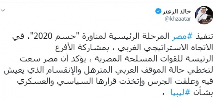 وكتب عبر تغريدة له على "تويتر" رصدها " المشهد العربي":"تنفيذ مصر المرحلة الرئيسية لمناورة "حسم 2020"، في الاتجاه الاستراتيجي الغربي ، بمشاركة الأفرع الرئيسة للقوات المسلحة المصرية ، يؤكد أن مصر سعت لتخطي حالة الموقف العربي المترهل والانقسام الذي يعيش فيه وعلقت الجرس واتخذت قرارها السياسي والعسكري بشأن ليبيا".