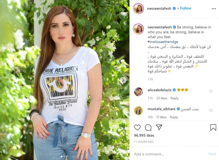 ونشرت نسرين صورا جديدة لأحدث إطلالتها، وعلقت: "كن قويا لأجلك.. ثق بنفسك.. آمن بحدسك.. اللطف قوة.. المثابرة والسعي قوة.. الامتنان والشكر لنعم الله قوة.. سلامك النفسي قوة.. تطوير ذاتك قوة.. صباحكم قوة".