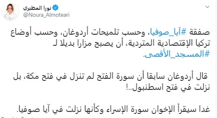 وقالت في تغريدة عبر "تويتر" رصدها "المشهد العربي": "صفقة آيا صوفيا، وحسب تلميحات أردوغان، وحسب أوضاع تركيا الإقتصادية المتردية، أن يصبح مزارا بديلا لـ المسجد الأقصى".