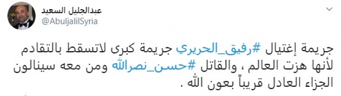 وكتب في تغريدة عبر "تويتر" رصدها "المشهد العربي": "جريمة اغتيال رفيق الحريري جريمة كبرى لا تسقط بالتقادم لأنها هزت العالم، والقاتل حسن نصرالله ومن معه سينالون الجزاء العادل قريباً بعون الله".