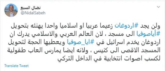 وكتب في تغريدة عبر "تويتر" رصدها "المشهد العربي": "ولن يجد أردوغان زعيما عربيا أو إسلاميا واحدا يهنئه بتحويل آيا صوفيا إلى مسجد، لأن العالم العربي والإسلامي يدرك أن أردوغان يخدم إسرائيل في آيا صوفيا ويعطيها الحجة لتحويل المسجد الأقصى إلى كنيس، ولأنه أيضًا يمارس ألعاب طفولية لكسب أصوات انتخابية في الداخل التركي".