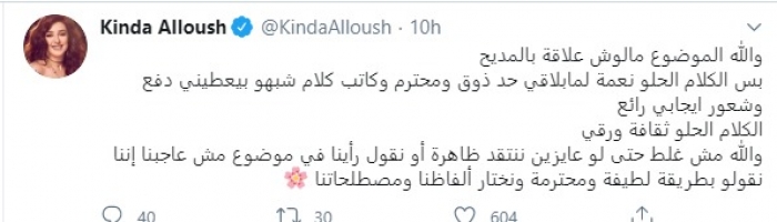 وكتبت كندة، عبر حسابها، قائلة: "والله الموضوع مالوش علاقة بالمديح.. بس الكلام الحلو نعمة.. لما بلاقي حد ذوق ومحترم وكاتب كلام حلو شبه بيعطيني دفع وشعور إيجابي رائع".