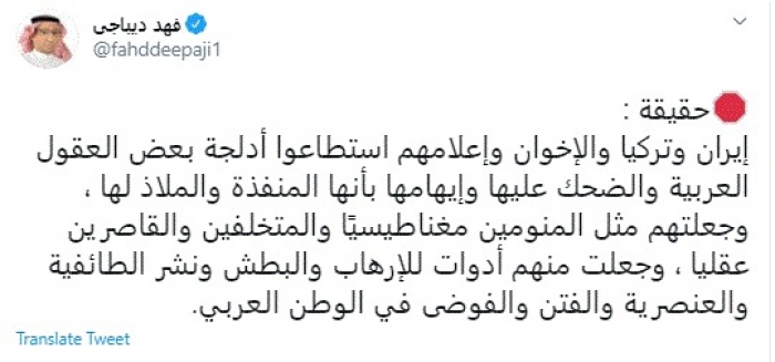 وقال في تغريدة عبر "تويتر" رصدها "المشهد العربي": "حقيقة.. إيران وتركيا والإخوان وإعلامهم استطاعوا أدلجة بعض العقول العربية والضحك عليها وإيهامها بأنها المنفذة والملاذ لها".