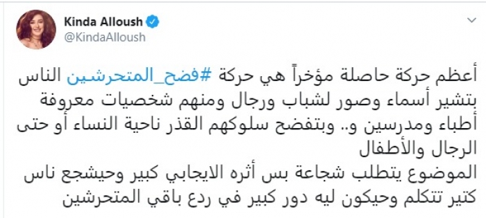 وكتبت كندة، عبر حسابها على تويتر، قائلة "أعظم حركة حاصلة مؤخراً هي حركة فضح المتحرشين.. الناس بتشير أسماء وصور لشباب ورجال ومنهم شخصيات معروفة أطباء ومدرسين وبتفضح سلوكهم القذر ناحية النساء أو حتى الرجال والأطفال".