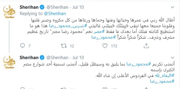 وكتبت شريهان عدة تغريدات، عبر حسابها الرسمي بموقع "تويتر"،: " أتمنى تكريم محمود رضا بما يليق به وسيظل قليل، أتمنى تسمية أحد شوارع مصر الكبرى باسمه، البقاء لله في الفردوس الأعلى إن شاء الله".