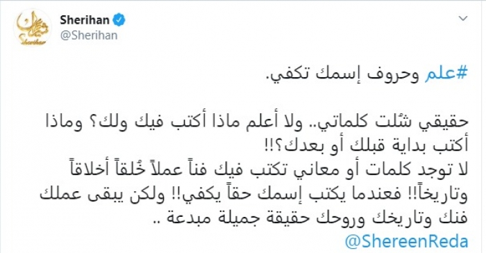 وتابعت شريهان :" علم وحروف اسمك تكفي، حقيقي شُلت كلماتي.. ولا أعلم ماذا أكتب فيك ولك؟ وماذا أكتب بداية قبلك أو بعدك، لا توجد كلمات أو معاني تكتب فيك فناً عملاً خُلقاً أخلاقاً وتاريخاً، فعندما يكتب إسمك حقاً يكفي، ولكن يبقى عملك فنك وتاريخك وروحك حقيقة جميلة مبدعة".