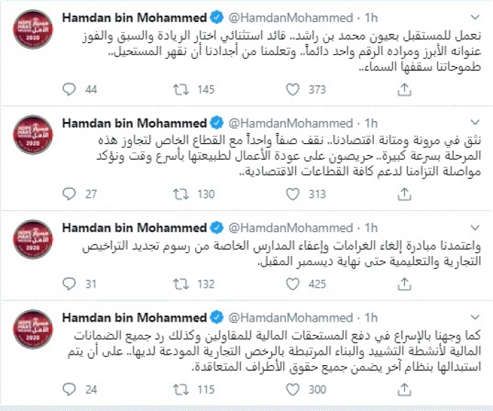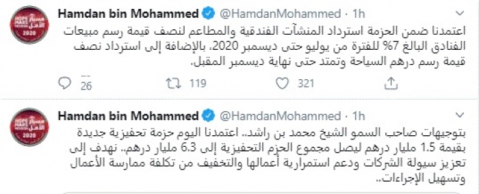 وقال في تغريدات عبر "تويتر" رصدها "المشهد العربي": "بتوجيهات صاحب السمو الشيخ محمد بن راشد.. اعتمدنا اليوم حزمة تحفيزية جديدة بقيمة 1.5 مليار درهم ليصل مجموع الحزم التحفيزية إلى 6.3 مليار درهم.. نهدف إلى تعزيز سيولة الشركات ودعم استمرارية أعمالها والتخفيف من تكلفة ممارسة الأعمال وتسهيل الإجراءات".