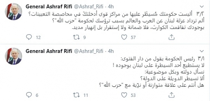 هاجم الوزير اللبناني السابق اللواء أشرف ريفي، اليوم، رئيس الحكومة اللبنانية حسان دياب بسبب حزب الله اللبناني.