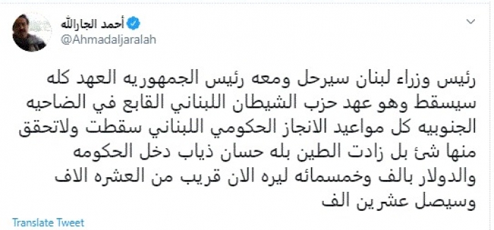 وقال في تغريدة عبر "تويتر" رصدها "المشهد العربي": "رئيس وزراء لبنان سيرحل ومعه رئيس الجمهورية العهد كله سيسقط وهو عهد حزب الشيطان اللبناني القابع في الضاحية الجنوبية كل مواعيد الإنجاز الحكومي اللبناني سقطت ولا تحقق منها شئ بل زادت الطين بلة".