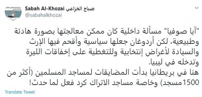 وكتب في تغريدة عبر "تويتر" رصدها "المشهد العربي": "آيا صوفيا مسألة داخلية كان ممكن معالجتها بصورة هادئة وطبيعية، لكن أردوغان جعلها سياسية وأقحم فيها الإرث والسيادة لأغراض انتخابية وللتغطية على إخفاقات الليرة وتدخله في ليبيا".
