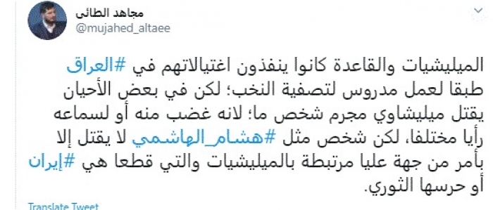 وأضاف: "لكن شخص مثل هشام الهاشمي لا يقتل إلا بأمر من جهة عليا مرتبطة بالمليشيات والتي قطعا هي إيران أو حرسها الثوري".