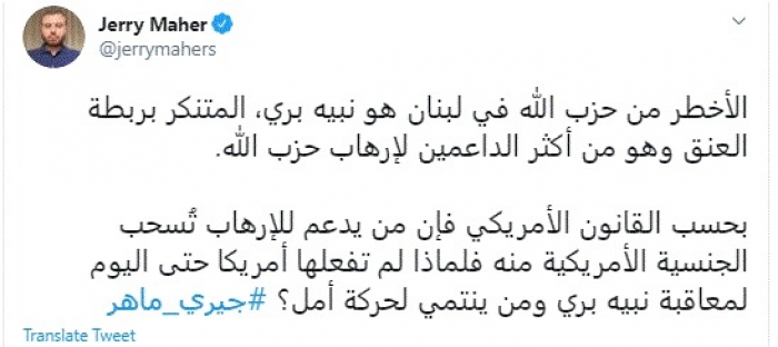 طالب الكاتب الصحفي اللبناني جيري ماهر، اليوم، الولايات المتحدة الأمريكية بمعاقبة رئيس مجلس النواب اللبناني نبيه بري وذلك جراء دعمه لإرهاب حزب الله وانتماءه لحركة أمل.