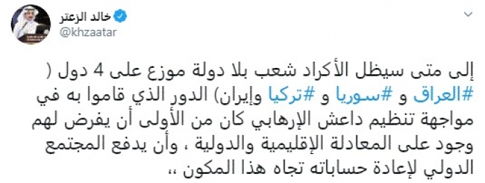 وقال في تغريدة عبر "تويتر" رصدها "المشهد العربي": "إلى متى سيظل الأكراد شعب بلا دولة موزع على 4 دول (العراق وسوريا وتركيا وإيران) الدور الذي قاموا به في مواجهة تنظيم داعش الإرهابي كان من الأولى أن يفرض لهم وجود على المعادلة الإقليمية والدولية ، وأن يدفع المجتمع الدولي لإعادة حساباته تجاه هذا المكون".
