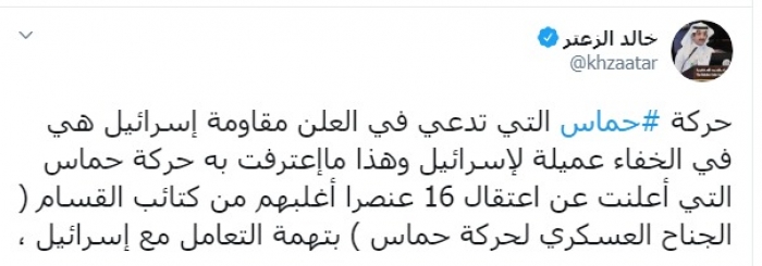 وكتب عبر تغريدة له على "تويتر" رصدها " المشهد العربي": "حركة حماس التي تدعي في العلن مقاومة إسرائيل هي في الخفاء عميلة لإسرائيل وهذا ما اعترفت به حركة حماس التي أعلنت عن اعتقال 16 عنصرا أغلبهم من كتائب القسام ( الجناح العسكري لحركة حماس ) بتهمة التعامل مع إسرائيل".