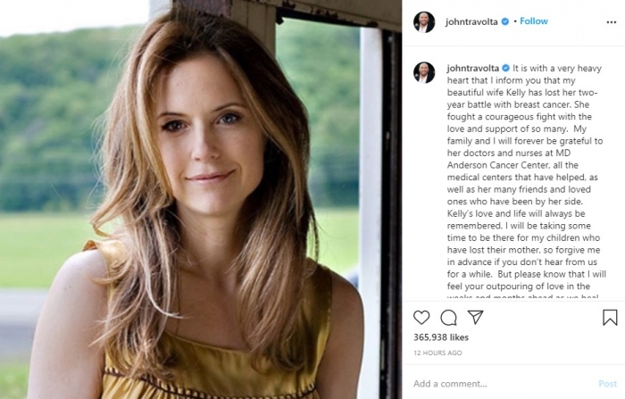 وقال ترافولتا (66 عاما) "أبلغكم بقلب يعتصره الألم أن زوجتي الجميلة كيلي خسرت معركتها التي استمرت عامين مع سرطان الثدي".