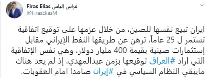 وقال في تغريدة عبر "تويتر" رصدها "المشهد العربي": "إيران تبيع نفسها للصين، من خلال عزمها على توقيع اتفاقية تستمر لـ 25 عاماً، ترهن عن طريقها النفط الإيراني مقابل استثمارات صينية بقيمة 400 مليار دولار".