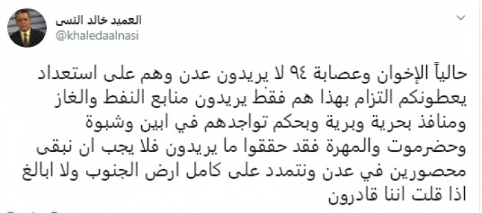وقال في تغريدة عبر "تويتر" رصدها "المشهد العربي": "حاليًا الإخوان وعصابة 94 لا يريدون عدن وهم على استعداد يعطونكم التزام بهذا هم فقط يريدون منابع النفط والغاز ومنافذ بحرية وبرية".