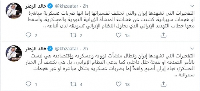وقال في تغريدات عبر "تويتر" رصدها "المشهد العربي": "التفجيرات التي تشهدها إيران وتطال منشأت نووية وعسكرية وإقتصادية هي ليست بالأمر الصدفه او نتيجة خلل داخلي كما يدعي النظام الإيراني، بل هي تكشف أن الخيار العسكري تجاه إيران أصبح واقعاً إما بضربات عسكرية بشكل مباشرة او عبر هجمات سيبرانية".
