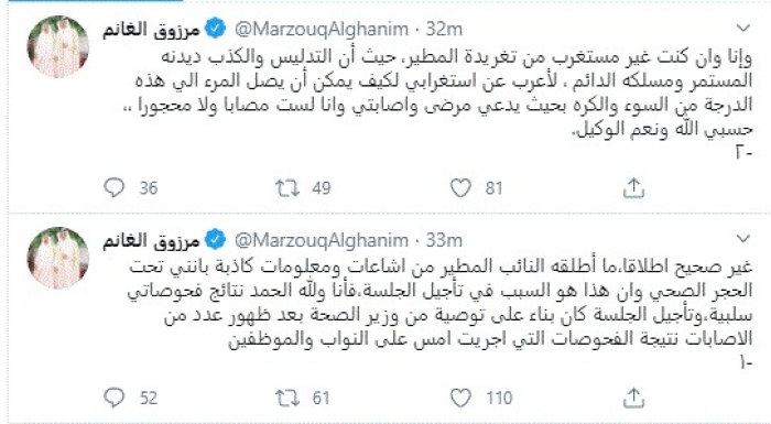 وقال في تغريدات عبر "تويتر" رصدها "المشهد العربي": "غير صحيح إطلاقا، ما أطلقه النائب المطير من إشاعات ومعلومات كاذبة بأنني تحت الحجر الصحي وأن هذا هو السبب في تأجيل الجلسة، فأنا ولله الحمد نتائج فحوصاتي سلبية، وتأجيل الجلسة كان بناء على توصية من وزير الصحة بعد ظهور عدد من الإصابات نتيجة الفحوصات التي أجريت أمس على النواب والموظفين".
