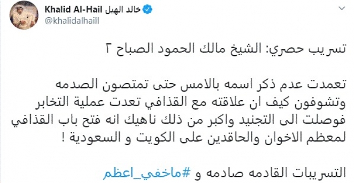 وقال في تغريدة عبر "تويتر" رصدها "المشهد العربي": "تسريب حصري: الشيخ مالك الحمود الصباح 2.. تعمدت عدم ذكر اسمه بالأمس حتى تمتصون الصدمة وتشوفون كيف أن علاقته مع القذافي تعدت عملية التخابر فوصلت إلى التجنيد واكبر من ذلك ناهيك أنه فتح باب القذافي لمعظم الإخوان والحاقدين على الكويت والسعودية".