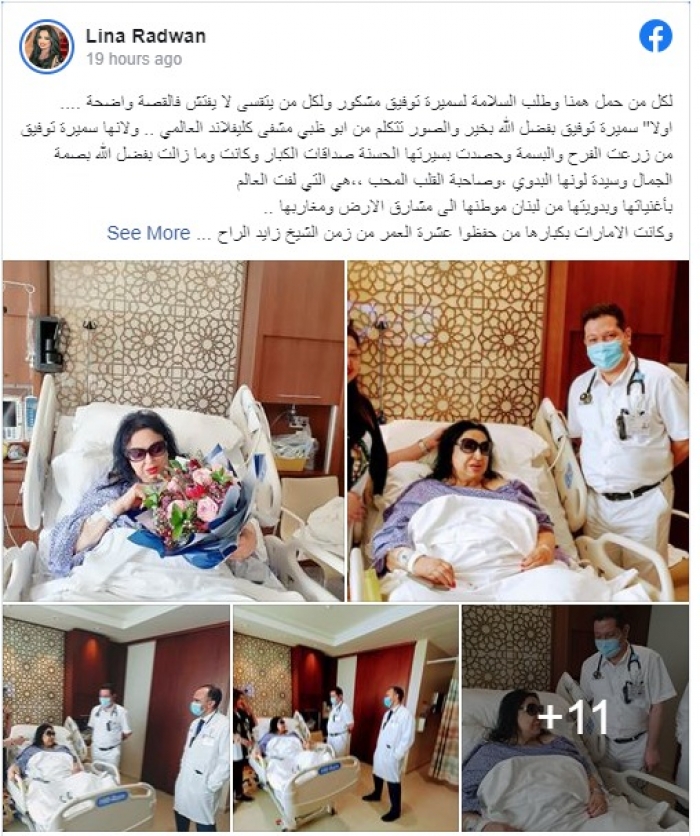 ونشرت لينا رضوان، ابنة شقيقة سميرة توفيق ومديرة أعمالها، أمس الأحد، صورا عبر حسابها على موقع "فيسبوك" للفنانة اللبنانية بعد العملية، وأرفقتها بتعليق أكدت فيه أن حالتها الصحية مستقرة حاليا.