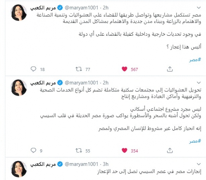 وقالت في تغريدات عبر "تويتر" رصدها "المشهد العربي": "إنجازات مصر في عصر السيسي تصل إلى حد الإعجاز".