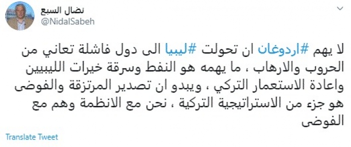 وكتب في تغريدة عبر "تويتر" رصدها "المشهد العربي": "لا يهم أردوغان إن تحولت ليبيا إلى دولة فاشلة تعاني من الحروب والإرهاب، ما يهمه هو النفط وسرقة خيرات الليبيين وإعادة الاستعمار التركي".
