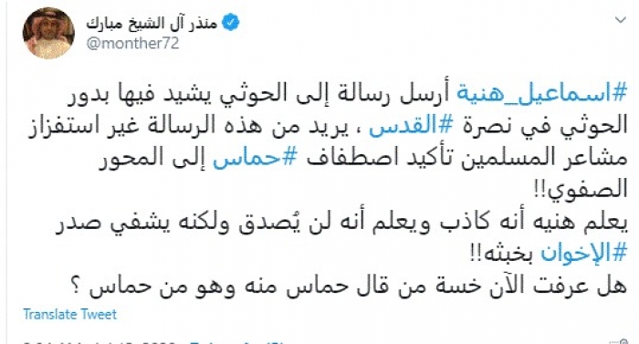 وقال في تغريدة عبر "تويتر" رصدها "المشهد العربي": "إسماعيل هنية أرسل رسالة إلى الحوثي يشيد فيها بدور الحوثي في نصرة القدس، يريد من هذه الرسالة غير استفزاز مشاعر المسلمين تأكيد اصطفاف حماس إلى المحور الصفوي".
