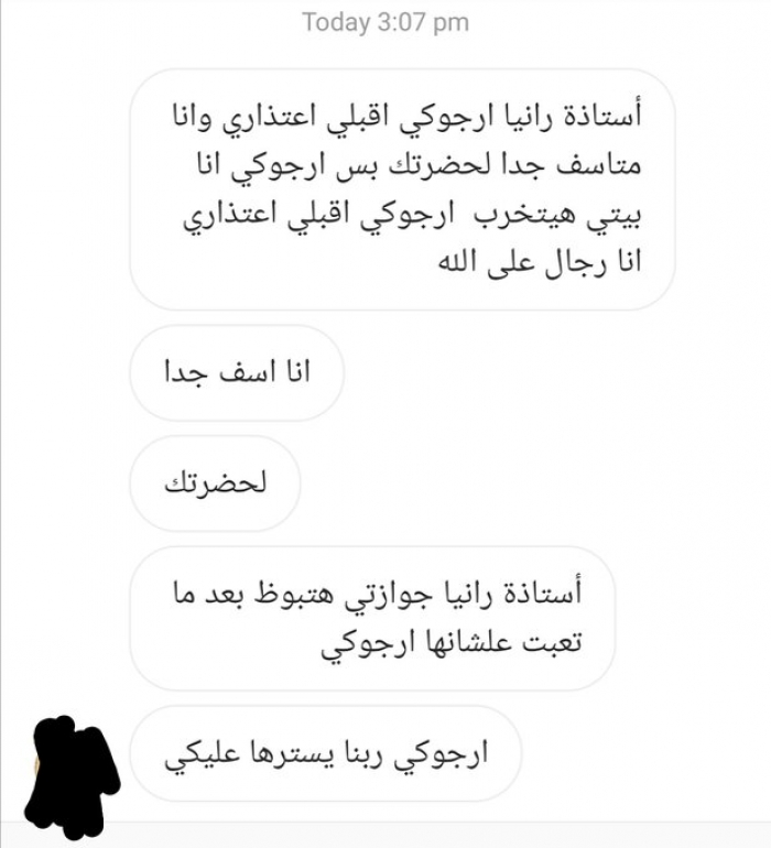 وظهر في المحادثة التي نشرت رانيا نصها، إنه يعتذر لها، ويطلب منها العفو حتى لا يتعرض لخسائر، قائلًا: "أستاذة رانيا أرجوكي اقبلي اعتذاري بيتي هيتخرب وجوازتي هتبوظ، أرجوكي ربنا يسترها عليكي".