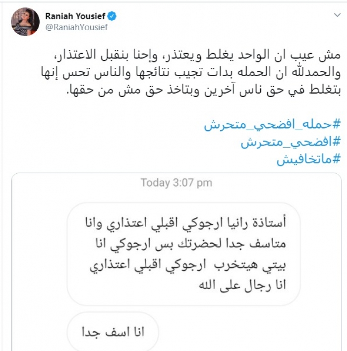 وكتبت رانيا: "مش عيب إن الواحد يغلط ويعتذر، واحنا بنقبل الاعتذار، والحمد لله إن الحملة بدأت تجيب نتائجها والناس تحس إنها بتغلط في حق ناس آخرين وبتاخد حق مش من حقها".