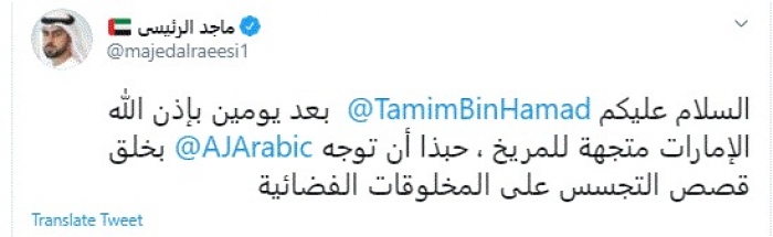 وقال في تغريدة عبر "تويتر" رصدها "المشهد العربي": "السلام عليكم تميم بن حمد بعد يومين بإذن الله الإمارات متجهة للمريخ، حبذا أن توجه الجزيرة بخلق قصص التجسس على المخلوقات الفضائية".