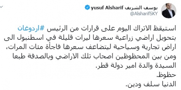 وكتب عبر تغريدة له على "تويتر" رصدها " المشهد العربي": "استيقظ الأتراك اليوم على قرارات من الرئيس أردوغان بتحويل أراضي زراعية سعرها ليرات قليلة في إسطنبول إلى أراض تجارية وسياحية ليتضاعف سعرها فجأة مئات المرات، ومن بين المحظوظين أصحاب تلك الأراضي وبالصدفة طبعا السيدة والدة أمير دولة قطر، حظوظ، الدنيا سلف ودين".