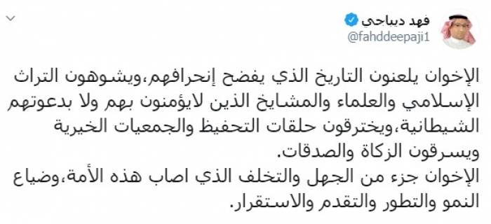 وكتب عبر تغريدة له على "تويتر" رصدها " المشهد العربي": "الإخوان يلعنون التاريخ الذي يفضح انحرافهم، ويشوهون التراث الإسلامي والعلماء والمشايخ الذين لا يؤمنون بهم ولا بدعوتهم الشيطانية، ويخترقون حلقات التحفيظ والجمعيات الخيرية ويسرقون الزكاة والصدقات".