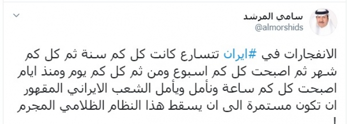 وكتب عبر تغريدة له على "تويتر" رصدها " المشهد العربي":"الانفجارات في إيران تتسارع، كانت كل كم سنة ثم كل كم شهر ثم أصبحت كل كم أسبوع ومن ثم كل كم يوم، ومنذ أيام أصبحت كل كم ساعة ونأمل ويأمل الشعب الإيراني المقهور أن تكون مستمرة إلى أن يسقط هذا النظام الظلامي المجرم".