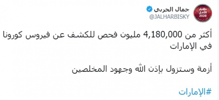 وكتب عبر تغريدة له على "تويتر" رصدها " المشهد العربي": "أكثر من 4,180,000 مليون فحص للكشف عن فيروس كورونا في الإمارات، أزمة وستزول بإذن الله وجهود المخلصين".