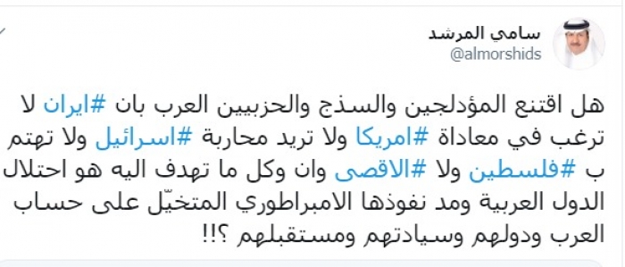 وكتب عبر تغريدة له على "تويتر" رصدها " المشهد العربي": "هل اقتنع المؤدلجين والسذج والحزبيين العرب بأن إيران لا ترغب في معاداة أمريكا ولا تريد محاربة إسرائيل ولا تهتم بفلسطين ولا الأقصى، وإن كل ما تهدف إليه هو احتلال الدول العربية ومد نفوذها الإمبراطوري المتخيّل على حساب العرب ودولهم وسيادتهم ومستقبلهم".
