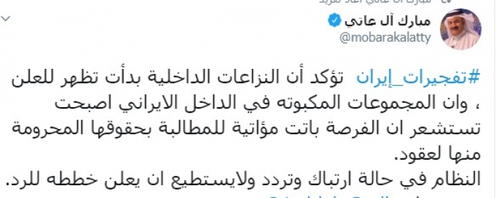 وكتب عبر تغريدة له على "تويتر" رصدها " المشهد العربي": "تفجيرات إيران تؤكد أن النزاعات الداخلية بدأت تظهر للعلن، وإن المجموعات المكبوتة في الداخل الإيراني أصبحت تستشعر أن الفرصة باتت مواتية للمطالبة بحقوقها المحرومة منها لعقود.