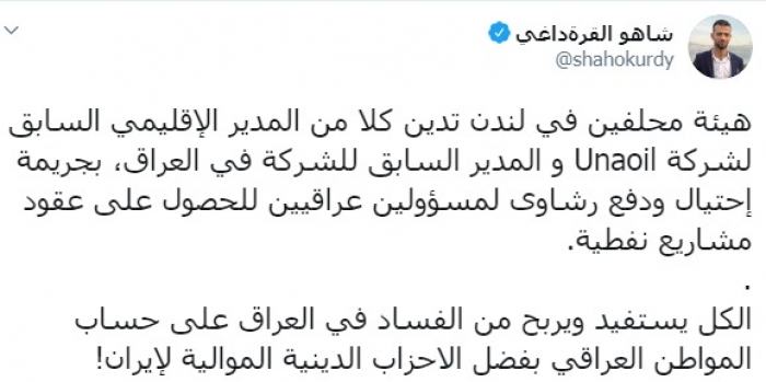 وكتب عبر تغريدة له على "تويتر" رصدها " المشهد العربي": "هيئة محلفين في لندن تدين كلا من المدير الإقليمي السابق لشركة Unaoil و المدير السابق للشركة في العراق، بجريمة احتيال ودفع رشاوى لمسؤولين عراقيين للحصول على عقود مشاريع نفطية، الكل يستفيد ويربح من الفساد في العراق على حساب المواطن العراقي بفضل الأحزاب الدينية الموالية لإيران".