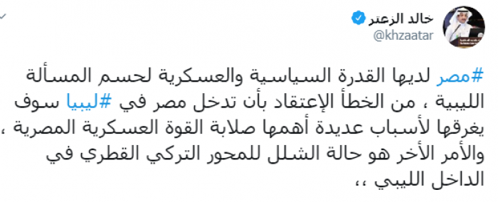 وكتب عبر تغريدة له على "تويتر" رصدها " المشهد العربي": "مصر لديها القدرة السياسية والعسكرية لحسم المسألة الليبية، من الخطأ الاعتقاد بأن تدخل مصر في ليبيا سوف يغرقها لأسباب عديدة أهمها صلابة القوة العسكرية المصرية، والأمر الأخر هو حالة الشلل للمحور التركي القطري في الداخل الليبي".