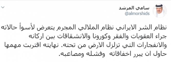 وكتب عبر تغريدة له على "تويتر" رصدها " المشهد العربي": "نظام الشر الإيراني نظام الملالي المجرم يتعرض لأسوأ حالاته جراء العقوبات والفقر وكورونا والانشقاقات بين أركانه والانفجارات التي تزلزل الأرض من تحته".