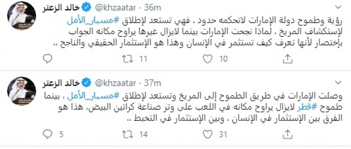 وكتب في تغريدات عبر "تويتر" رصدها "المشهد العربي": "وصلت الإمارات في طريق الطموح إلى المريخ وتستعد لإطلاق مسبار الأمل، بينما طموح قطر لا يزال يراوح مكانه في اللعب على وتر صناعة كراتين البيض، هذا هو الفرق بين الإستثمار في الإنسان، وبين الاستثمار في التخبط".