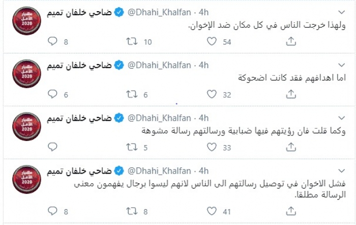 وقال في تغريدات عبر "تويتر" رصدها "المشهد العربي": "فشل الاخوان في توصيل رسالتهم الى الناس لانهم ليسوا برجال يفهمون معنى الرسالة مطلقا.
