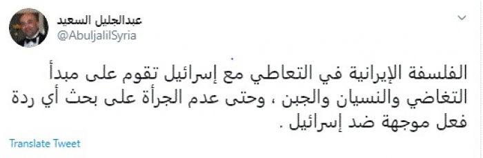 وكتب في تغريدة عبر "تويتر" رصدها "المشهد العربي": "الفلسفة الإيرانية في التعاطي مع إسرائيل تقوم على مبدأ التغاضي والنسيان والجبن، وحتى عدم الجرأة على بحث أي ردة فعل موجهة ضد إسرائيل".