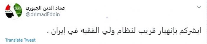 وقال في تغريدة عبر "تويتر" رصدها "المشهد العربي": "ابشركم بإنهيار قريب لنظام ولي الفقيه في إيران".