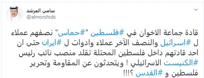 وقال في تغريدة عبر "تويتر" رصدها "المشهد العربي": "قادة جماعة الإخوان في فلسطين حماس نصفهم عملاء لإسرائيل والنصف الآخر عملاء وأدوات لإيران حتى أن أحد قادتهم داخل فلسطين المحتلة تقلد منصب نائب رئيس الكنيست الإسرائيلي! ويتحدثون عن المقاومة وتحرير فلسطين والقدس".