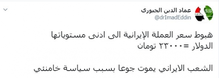وكتب الجبوري عبر تغريدة له على "تويتر" رصدها " المشهد العربي":" هبوط سعر العملة الإيرانية إلى أدنى مستوياتها، الدولار يساوي23000 تومان، الشعب الإيراني يموت جوعًا بسبب سياسة خامنئي".