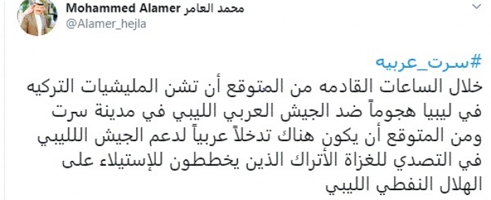 وقال في تغريدة عبر "تويتر" رصدها "المشهد العربي": "خلال الساعات القادمة من المتوقع أن تشن المليشيات التركيه في ليبيا هجوماً ضد الجيش العربي الليبي في مدينة سرت".