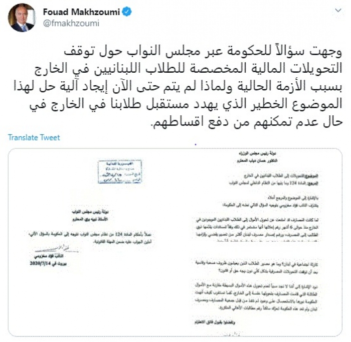 وقال في تغريدة عبر "تويتر" رصدها "المشهد العربي": "وجهت سؤالاً للحكومة عبر مجلس النواب حول توقف التحويلات المالية المخصصة للطلاب اللبنانيين في الخارج بسبب الأزمة الحالية ولماذا لم يتم حتى الآن إيجاد آلية حل لهذا الموضوع الخطير الذي يهدد مستقبل طلابنا في الخارج في حال عدم تمكنهم من دفع اقساطهم".